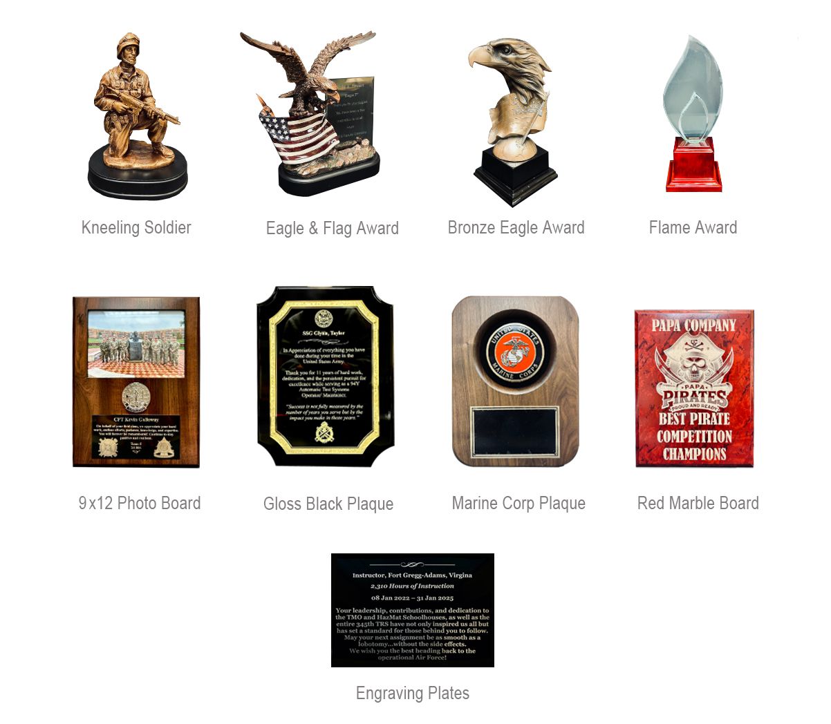We offer personalized engraving on various materials, including glass, wood, acrylic, and metal, to create unique awards and keepsakes for sports, military, and civilian events.